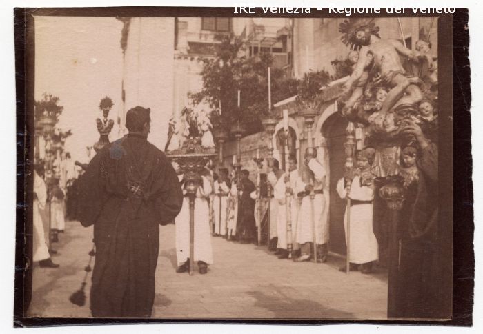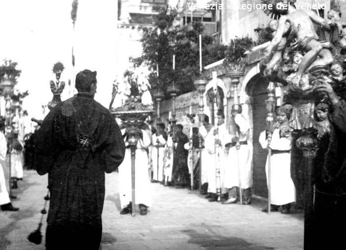 Venezia - Vita veneziana e lagunare - Manifestazioni religiose - Processione del Corpus Domini - Zattere: fondamenta, verso chiesa di S. Maria del Rosario vulgo Gesuati - Confratelli - Segnali processionali - Aste portacero - Tuniche: bianche, nera