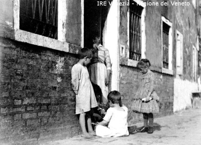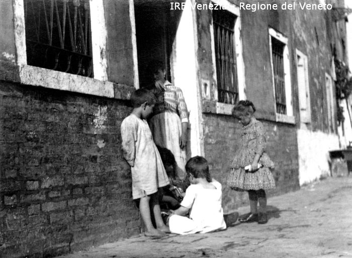 Vita veneziana e lagunare - Scene e costumi - Momenti di vita quotidiana - Località non identificata: Venezia ? Territorio di Chioggia ? - Esterno: una calle - Bambini che giocano sulla porta di casa - Entrata di una abitazione