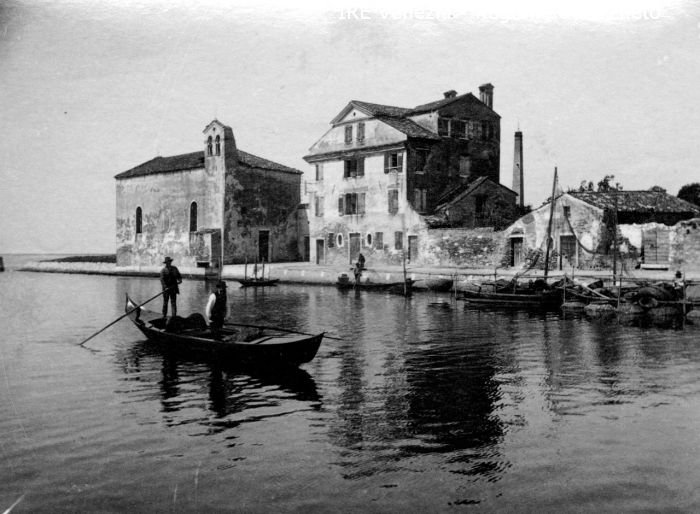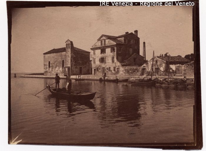 Venezia - Vita veneziana e lagunare - Scene e costumi - Momenti di vita quotidiana - Laguna di Venezia - Canale e località non identificati - Due persone: che remano - Imbarcazione: gondola ? - Abitazioni - Una chiesa