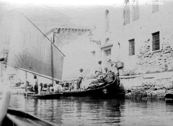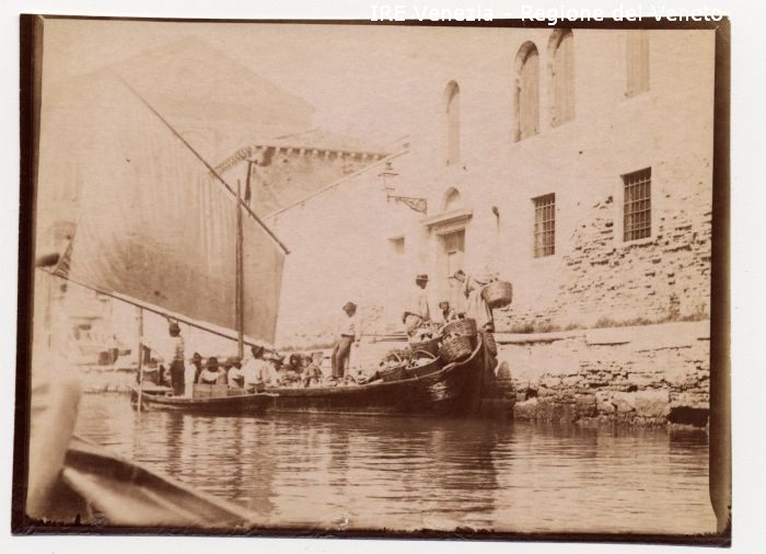 Venezia - Vita veneziana e lagunare - Scene e costumi - Momenti di vita quotidiana - Fondamenta non localizzata ( Misericordia ?) - Donne su una riva - Ceste con ortaggi - Imbarcazione: peata