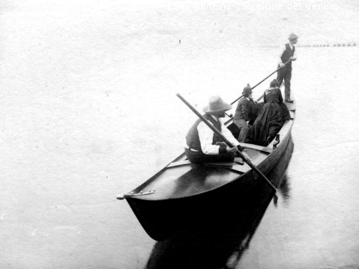 Venezia - Vita veneziana e lagunare - Modelli in posa per scene di genere - Laguna di Venezia - Ponte ferroviario - Imbarcazione: tipo di gondola - Passeggeri