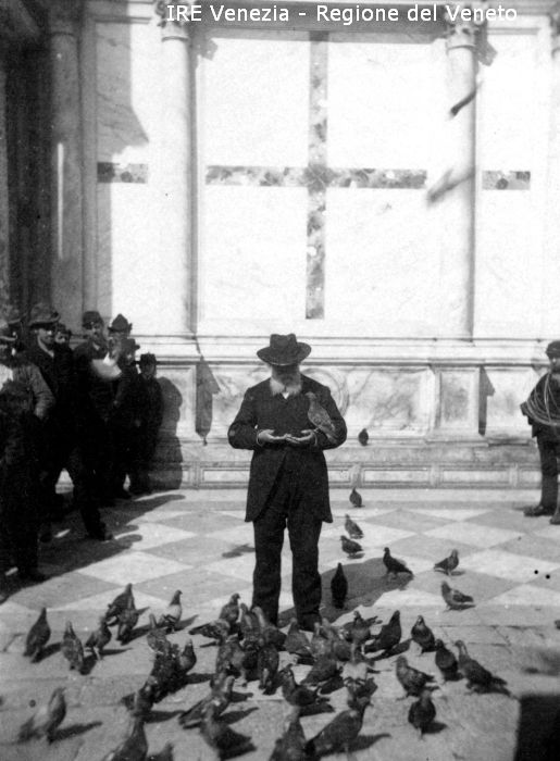 Venezia - Vita veneziana e lagunare - Scene e costumi - Turismo - Piazza S. Marco - Basilica di S. Marco - Turista con piccioni - Passanti