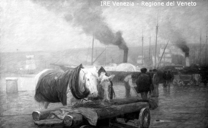 Venezia, Esposizione Internazionale d'Arte, riproduzione dipinto, Pietro Fragiacomo, "Cavalli stanchi"