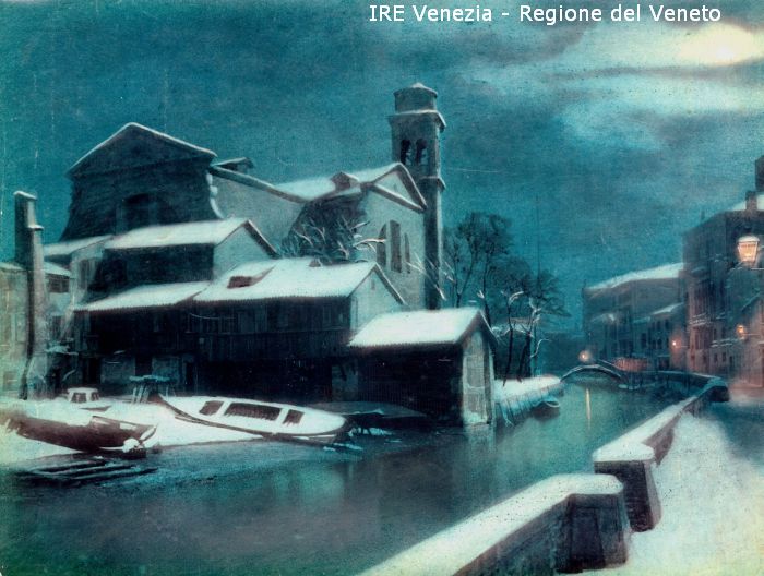 Venezia - Vedute, monumenti, luoghi - Centro storico - Canali e Rii - Dorsoduro - Rio di S. Trovaso o delle Maravege - Squero di S. Trovaso - Chiesa di S. Trovaso - Barche - Neve