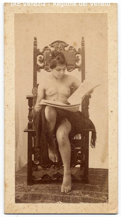 Venezia - Vita veneziana e lagunare - Modelli in posa per scene di genere - In studio - Ragazza: a petto nudo, seduta; che legge un giornale - Scialle nero - Piedistallo