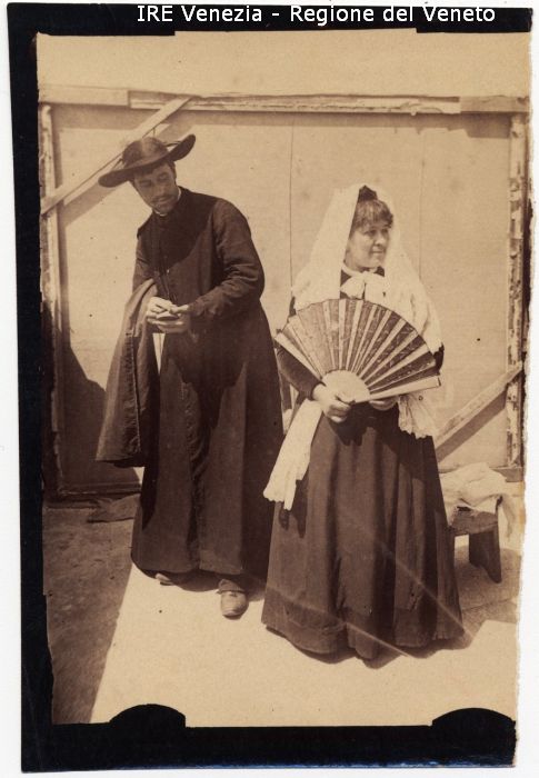 Venezia - Vita veneziana e lagunare - Scene di genere - Esterni: una terrazza - Modelli in posa - Studio su figura di donna e uomo in foggia di prete