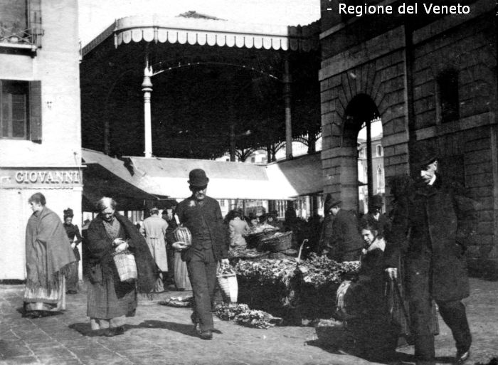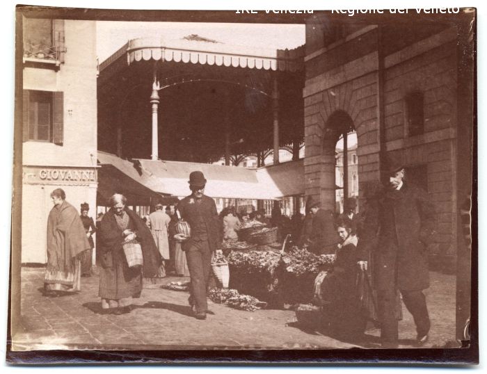 Venezia - Vita veneziana e lagunare - Scene e costumi - Mercato, negozi, bancarelle - Rialto - Campo Cesare Battisti già della Bella Vienna - Botteghe - Ambulanti - Passanti - Scene di mercato - Mercato coperto