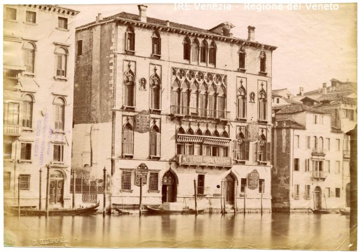 Insegne sulla facciata del palazzo: "Premiata fabbrica/ merletti/ d'ogni genere/ con scuola professionale/ d'imitazione/ di punti antichi/ esposizione permanente/ grande deposito merletti/ antichi di Venezia/ succursale/ piazza S. Marco N.° 82."