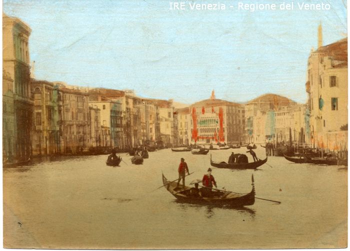 Venezia - Vedute, monumenti, luoghi - Centro storico - Canal Grande (da Rialto verso la "Volta di Canal") - Ca' Foscari - Gondole - Gondolieri che remano