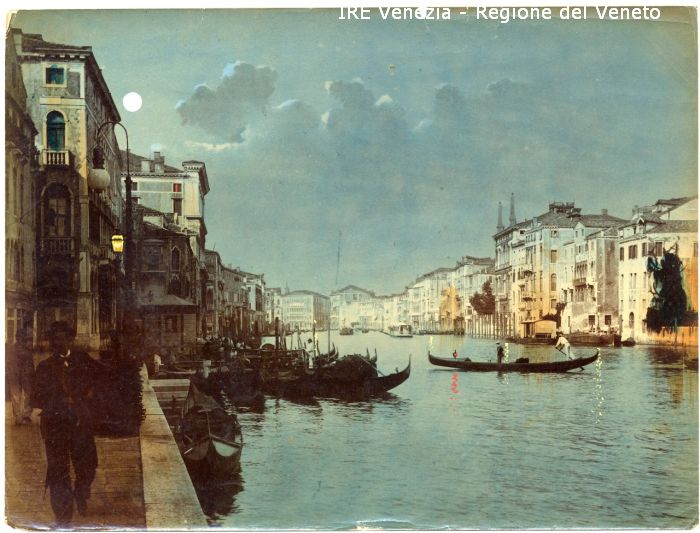 Venezia - Vedute, monumenti, luoghi - Centro storico - Canal Grande (da Rialto verso la "Volta di Canal") - Riva del Carbon - Traghetto del Carbon - Ca' Foscari - Pontile di S. Silvestro - Persone - Gondole - Gondolieri che remano