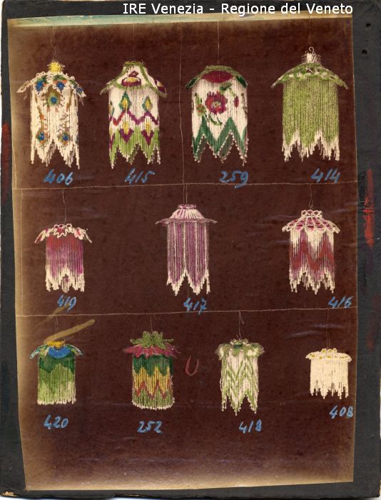 Venezia - Vita veneziana e lagunare - Attività private - Laboratori e Ditte di "Specialità veneziane" - Artigianato: vetrerie - Società Veneziana delle Conterie - Campionario - Oggetti di vetro: undici abat-jour di perline