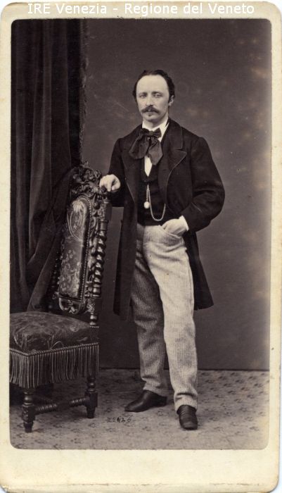 Ritratti: in studio; figura intera; in semi profilo - Uomo: con baffi e pizzo; in piedi, con la mano destra poggiata su una sedia - Vestiario: giacca scura, gilét, camicia bianca, pantaloni chiari a righe; cravattino, orologio da taschino