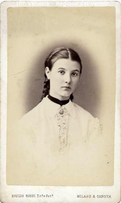 Ritratti: in studio; mezzo busto; in semi profilo - Ragazza - Acconciatura: capelli raccolti con un frontino, lunghe trecce - Vestiario: abito chiaro - Gioielli: collana - Sfondo