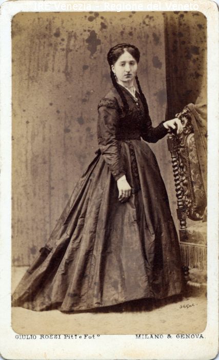 Ritratti: in studio; figura intera; in semi profilo - Donna; in piedi, con la mano sinistra poggiata su una sedia - Acconciatura: lunghe trecce - Vestiario: abito scuro - Gioielli: orecchini, spilla