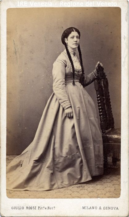 Ritratti: in studio; figura intera; in semi profilo - Donna; in piedi, con la mano sinistra poggiata su una sedia - Acconciatura: lunghe trecce - Vestiario: abito chiaro - Gioielli: orecchini, spilla