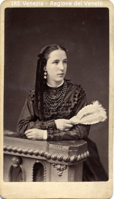 Ritratti: in studio; mezza figura; in semi profilo - Ritratto di G. Vernazzi - Ragazza; poggiata a una balaustra, con un ventaglio di piume bianche nella mano destra - Acconciatura: lungo nastrino con fiocco - Vestiario: abito scuro