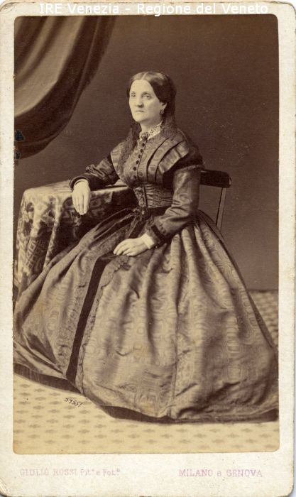 Ritratti: in studio; figura intera; in semi profilo - Donna; seduta, con il braccio destro poggiato su un tavolino - Acconciatura: capelli raccolti, velo di pizzo - Vestiario: abito chiaro - Gioielli: orecchini, spilla