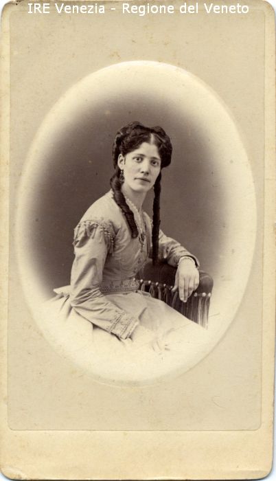 Ritratti: in studio; mezza figura; in semi profilo - Donna; seduta, con il braccio sinistro poggiato sul bracciolo di una sedia - Acconciatura: lunghi boccoli, nastrino - Vestiario: abito chiaro - Gioielli: orecchini