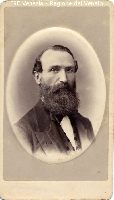 Ritratti: in studio; mezzo busto; in semi profilo - Uomo, con baffi e lunga barba - Vestiario: giacca scura, gilét, camicia bianca, cravattino - Sfondo