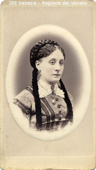 Ritratti: in studio; mezzo busto; in semi profilo - Ragazza - Acconciatura: lunghe trecce - Vestiario: abito con camicia di pizzo - Gioielli: orecchini, spilla, collana - Sfondo