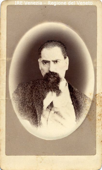 Ritratti: in studio; mezzo busto; frontale - Uomo, con baffi e barba - Vestiario: giacca scura, gilét, camicia bianca - Sfondo