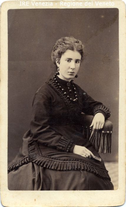 Ritratti: in studio; mezza figura; in semi profilo - Donna; seduta, con il braccio sinistro poggiato sul bracciolo di una sedia e un ventaglio chiuso nella mano destra - Acconciatura: capelli raccolti con un fermaglio - Vestiario: abito scuro