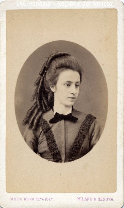 Ritratti: in studio; mezzo busto; in semi profilo - Ritratto di Ferruzzi - Ragazza - Acconciatura: lunghi boccoli - Vestiario: abito chiaro, nastrino scuro - Sfondo