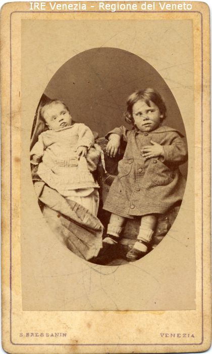 Ritratti: in studio; figura intera; frontale - Bambine: due - Neonata; sdraiata, avvolta in una coperta - Vestiario: abito bianco - Bambina; seduta, con la mano sinistra sul cuore - Vestiario: cappottino - Sfondo