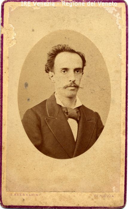Ritratti: in studio; mezzo busto; in semi profilo - Uomo: con baffi - Vestiario: giacca scura, camicia bianca, cravattino - Sfondo