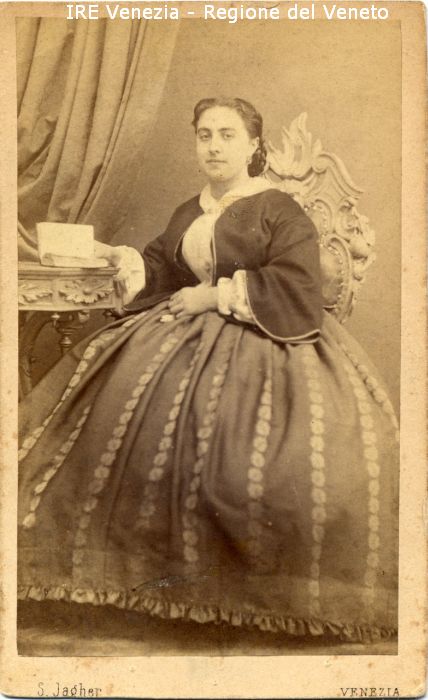 Ritratti: in studio; figura intera; in semi profilo - Donna; seduta, con libro aperto nella mano destra - Acconciatura: treccia raccolta a chignon - Vestiario: gonna con fasce decorate a fiori, camicia bianca, mantellina scura