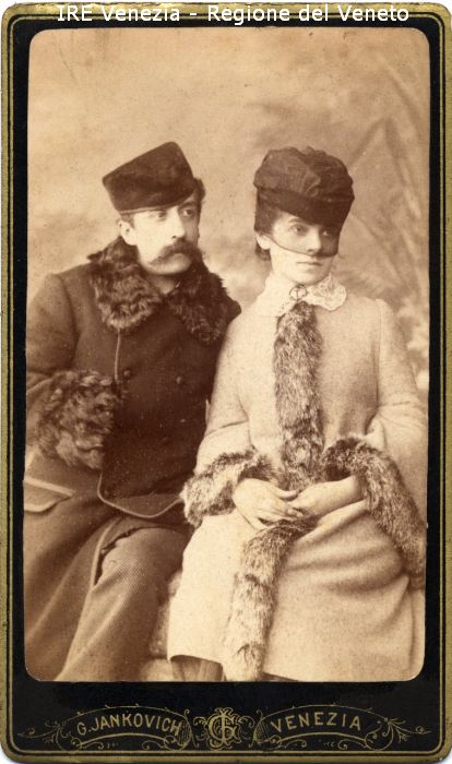 Ritratti: in studio; mezza figura; in semi profilo - Coppia: marito e moglie, a braccetto; seduti - Uomo: con baffi e barba - Vestiario: cappotto scuro con collo e polsini di pelliccia, cappello tipo colbacco