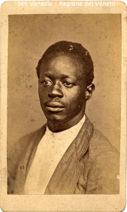 Ritratti: in studio; mezzo busto; in semi profilo - Uomo: con baffi e pizzo, di razza africana - Vestiario: giacca, camicia bianca - Sfondo