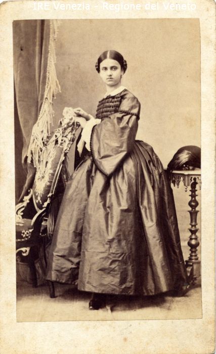 Ritratti: in studio; figura intera; frontale - Donna; in piedi, con le mani poggiate sullo schienale di una poltroncina - Acconciatura: capelli raccolti con due chignon laterali - Vestiario: abito scuro con ampie maniche