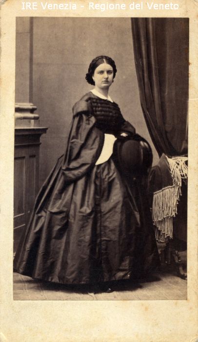 Ritratti: in studio; figura intera; in semi profilo - Donna; in piedi, con un cappello in mano - Acconciatura: treccia raccolta a chignon - Vestiario: abito scuro con ampie maniche - Gioielli: orecchini - Arredamento: tenda - Sfondo