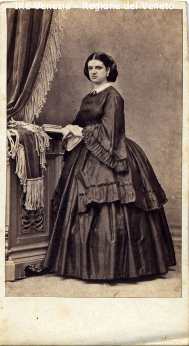 Ritratti: in studio; figura intera; in semi profilo - Donna; in piedi, con le mani incrociate, poggiate su un mobiletto - Acconciatura: capelli raccolti - Vestiario: abito scuro - Gioielli: orecchini
