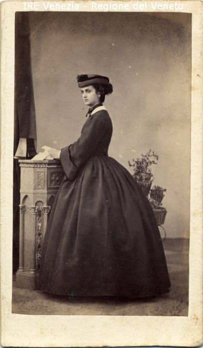Ritratti: in studio; figura intera; in semi profilo - Donna; in piedi, con in mano una lettera, poggiata su una balaustra - Vestiario: abito scuro; cappello - Gioielli: orecchini