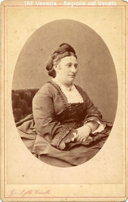 Ritratti: in studio; mezza figura; in semi profilo - Donna; seduta, con le mani conserte - Acconciatura: treccia raccolta a chignon - Vestiario: abito scuro, camicia bianca di merletto - Gioielli: orecchini, spilla, bracciale, vera