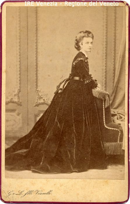 Ritratti: in studio; figura intera; in semi profilo - Donna; in piedi, con le mani appoggiate sullo schienale di una poltroncina - Acconciatura: treccia raccolta a chignon - Vestiario: abito scuro - Gioielli: orecchini