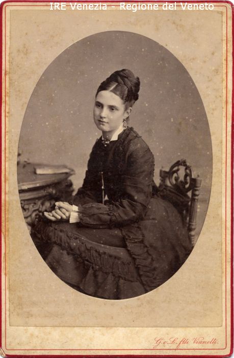 Ritratti: in studio; mezza figura; in semi profilo - Ragazza; seduta, con le mani conserte - Acconciatura: capelli raccolti a chignon - Vestiario: abito scuro, camicia bianca - Gioielli: orecchini, spilla