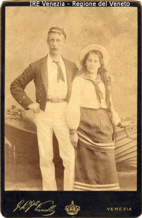 Ritratti: in studio; mezza figura; in semi profilo - Padre e figlia - Uomo: con baffi; in piedi, con la mano sinistra sulla spalla della ragazza - Vestiario: abito alla marinara, con cappello