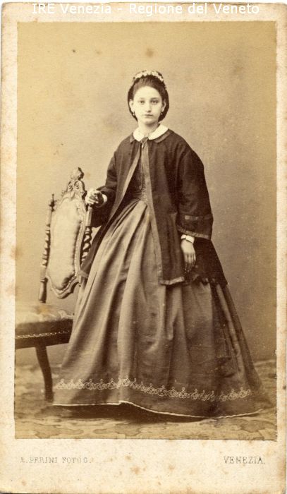 Ritratti: in studio; figura intera; frontale - Ritratto di Angelina Martini - Ragazza; in piedi, con la mano destra appoggiata allo schienale di una sedia