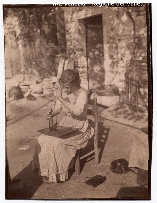 Venezia - Vita veneziana e lagunare - Scene e costumi - Luogo non identificato - Esterno di un'abitazione - Pergolato - Giovane infilatrice di perle al lavoro - Impiraressa