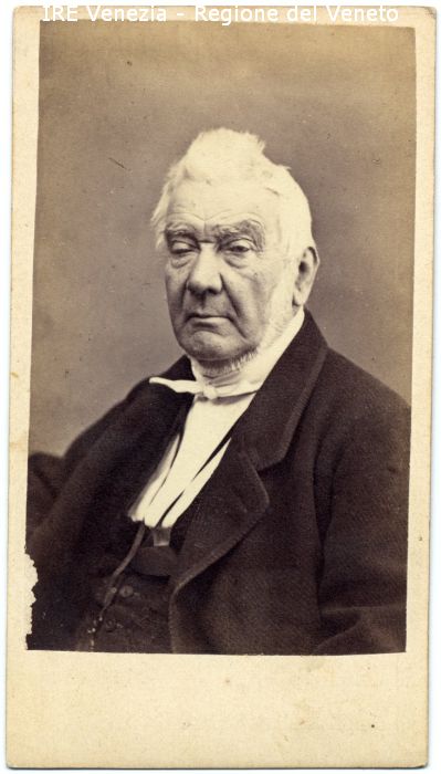 Ritratto: in studio; mezzo busto - Uomo: anziano - Vestiario: giacca scura, camicia bianca, fazzoletto al collo - Sfondo