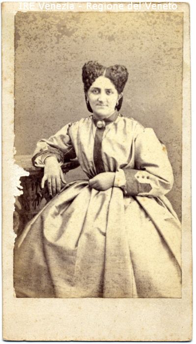 Ritratto: in studio; mezza figura - Donna: seduta, appoggiata con il gomoto destro su un tavolino - Acconciatura: elaborata - Vestiario: abito chiaro - Gioielli: orecchini, anello, spilla - Arredamento: tavolino - Sfondo