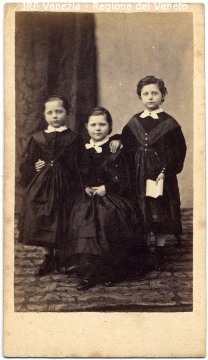 Ritratti: in studio, figure intere, frontali - Bambine: tre - Bambina: a sinistra, in piedi, dà la mano a quella in centro - Bambina: al centro, seduta, dà la mano a quella di sinistra e con l'altra le cinge la vita