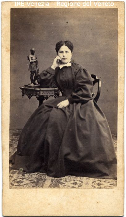 Ritratto di Giuseppina Sartorelli - Ritratto: in studio, figura intera, in semi profilo - Ragazza: seduta, con il gomito destro appoggiato su un tavolino e la mano sulla guancia - Vestiario: abito scuro con colletto bianco