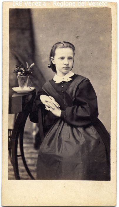 Ritratto di Cornelia Buratti - Ritratto: in studio, mezza figura, in semi profilo - Ragazza: seduta, con le mani intrecciate, appoggiata allo schienale della sedia - Vestiario: abito scuro con grembiule e colletto bianco