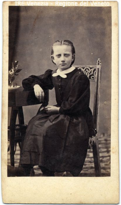 Ritratto di Rita Davidì - Ritratto: in studio, mezza figura, frontale - Bambina: seduta, con il gomito destro appoggiato su un tavolino - Vestiario: abito scuro con colletto bianco