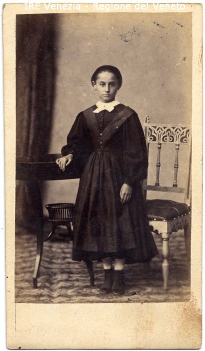 Ritratto: in studio, figura intera, frontale - Bambina: in piedi, con la mano destra appoggiata su un tavolino - Vestiario: abito scuro con grembiule e colletto bianco