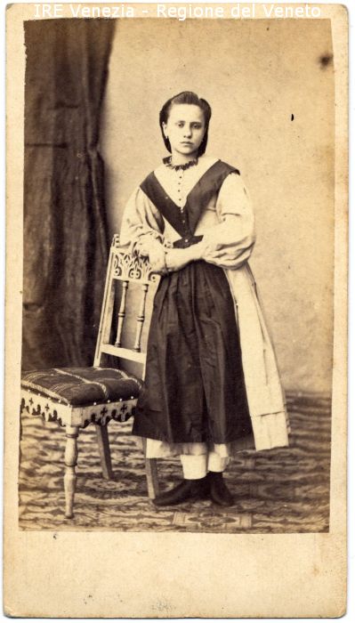 Ritratto di Ant. Parrolan - Ritratto: in studio, figura intera, frontale - Ragazza: in piedi, con le mani unite, appoggiata ad una sedia - Vestiario: abito chiaro con grembiule